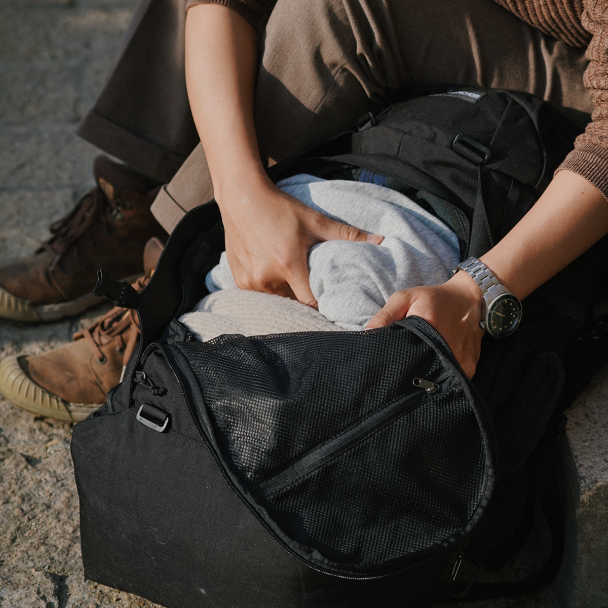 CLAST 隨身後背包除了能夠在必要時於背包前方模組擴充增加容量,也適合在旅行間做為子包使用,日常的背負同樣沒有問題。