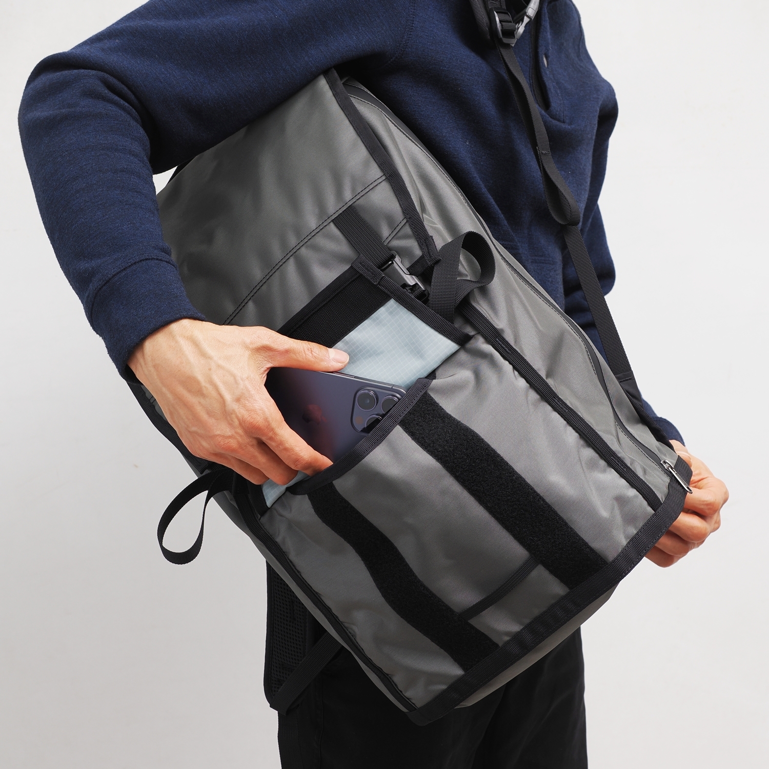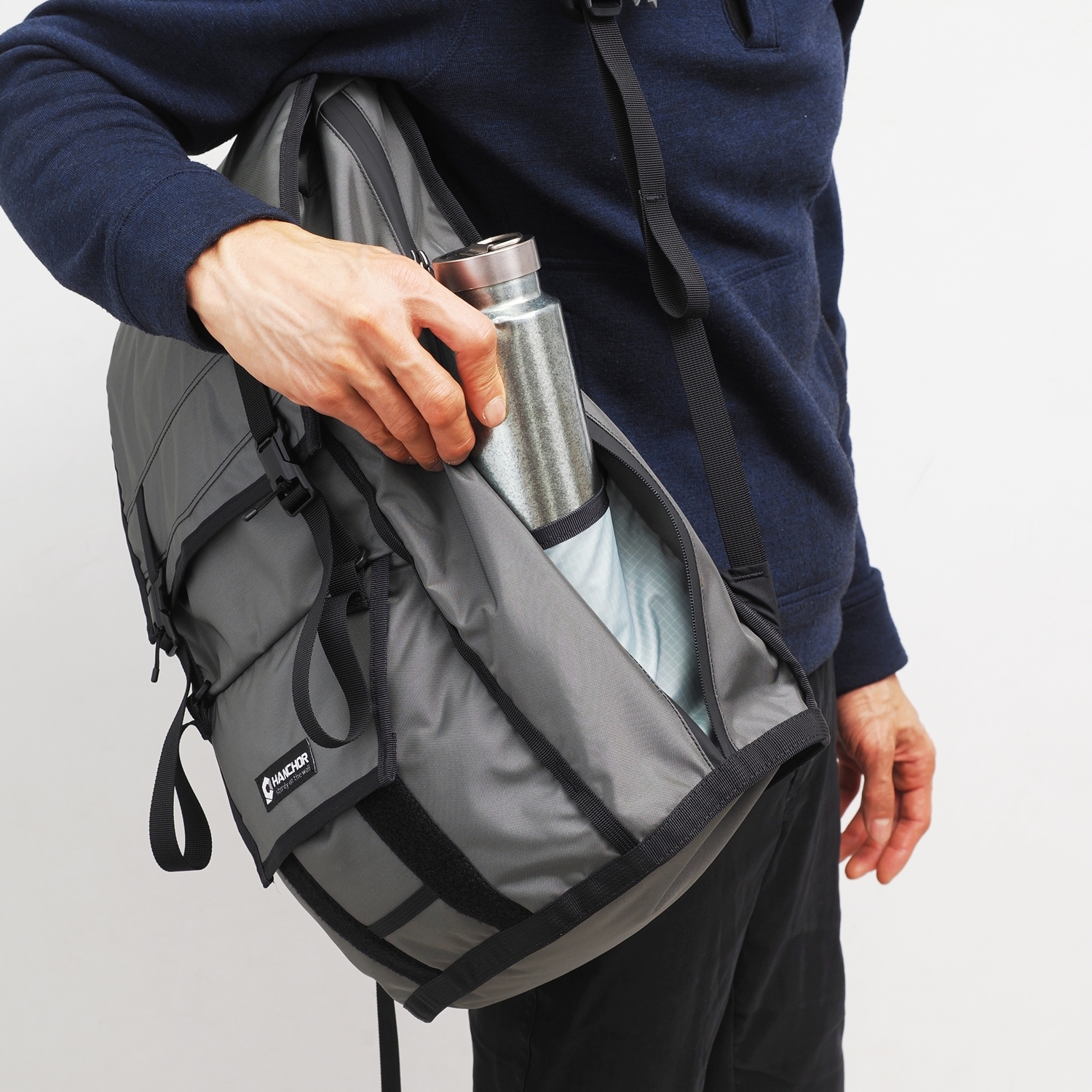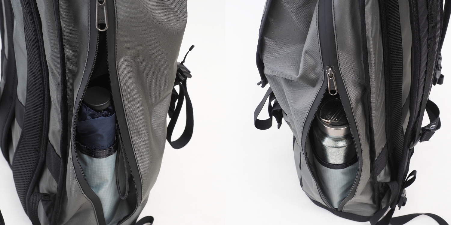 Both sides of the SKARN feature direct-access zippers to the main compartment. Inside, hidden pockets made of elastic fabric securely hold water bottles or umbrellas, maintaining a sleek, clean appearance while ensuring quick access.