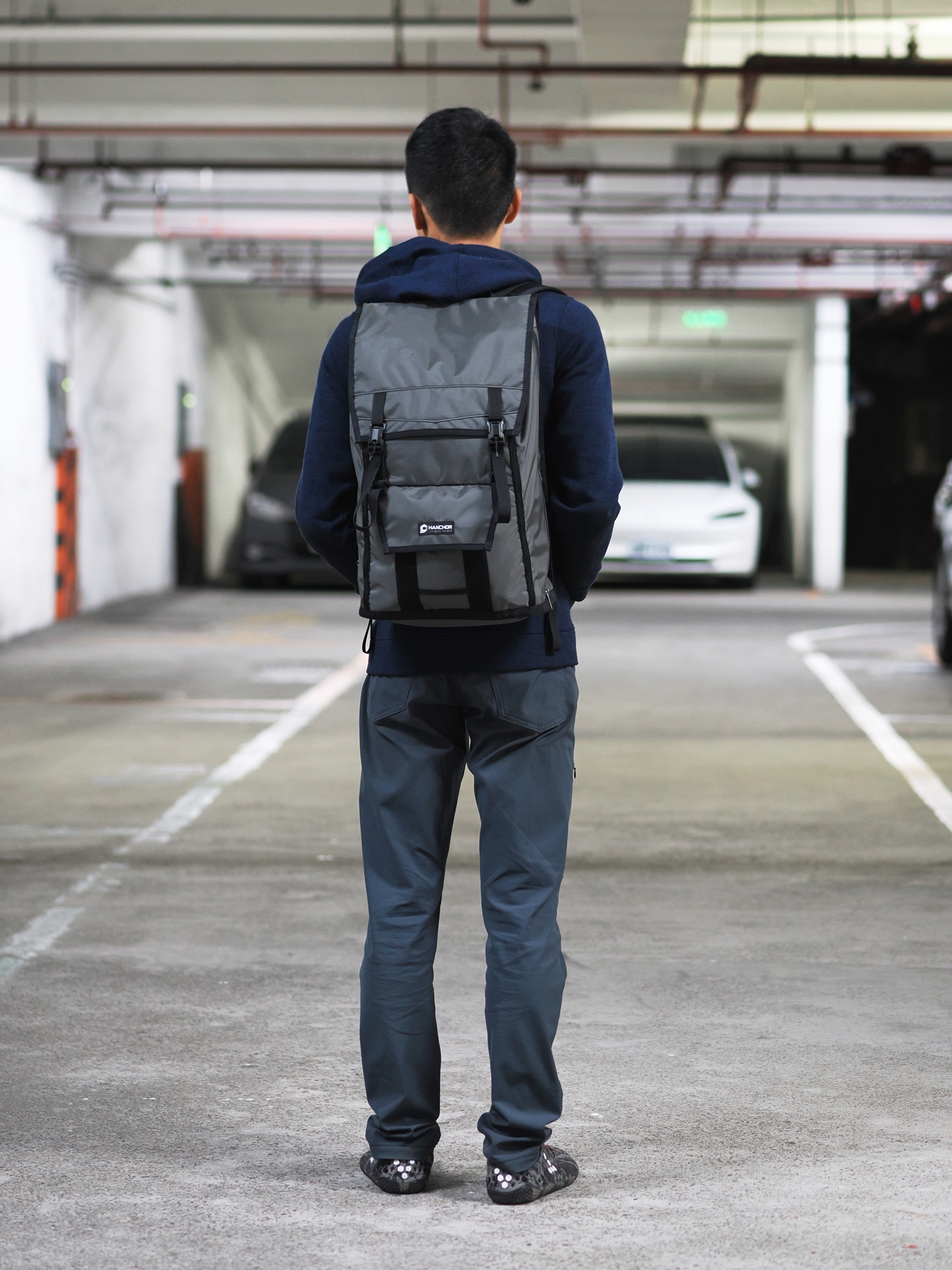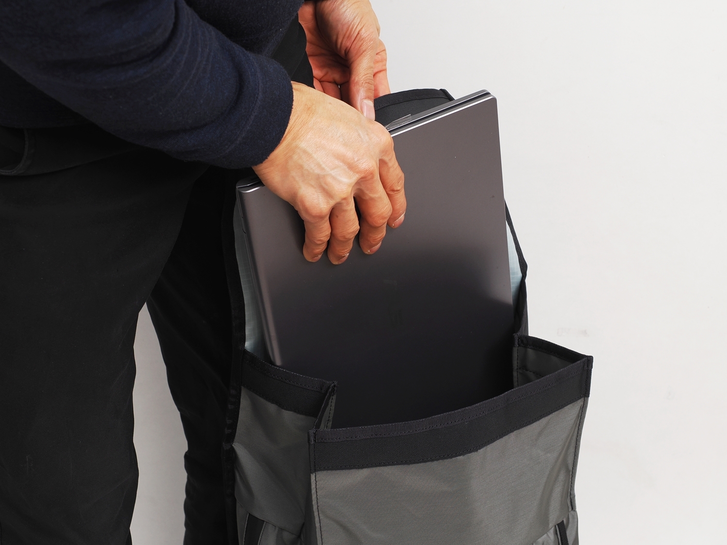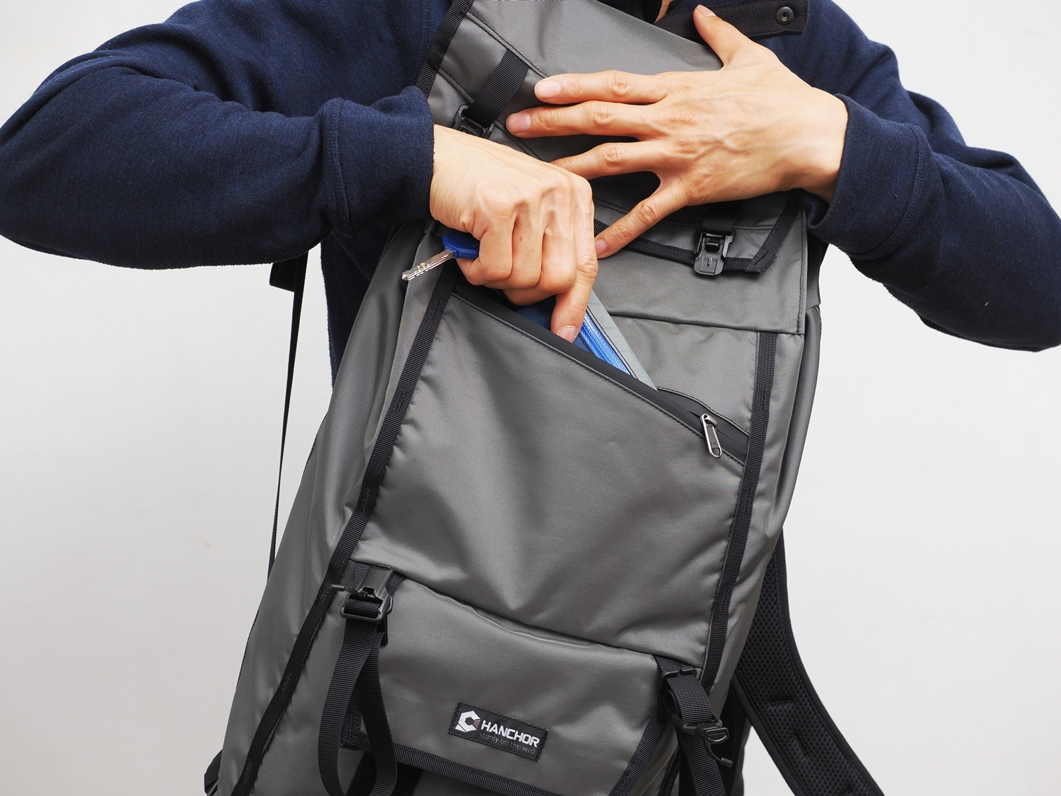 Both sides of the SKARN feature direct-access zippers to the main compartment. Inside, hidden pockets made of elastic fabric securely hold water bottles or umbrellas, maintaining a sleek, clean appearance while ensuring quick access.