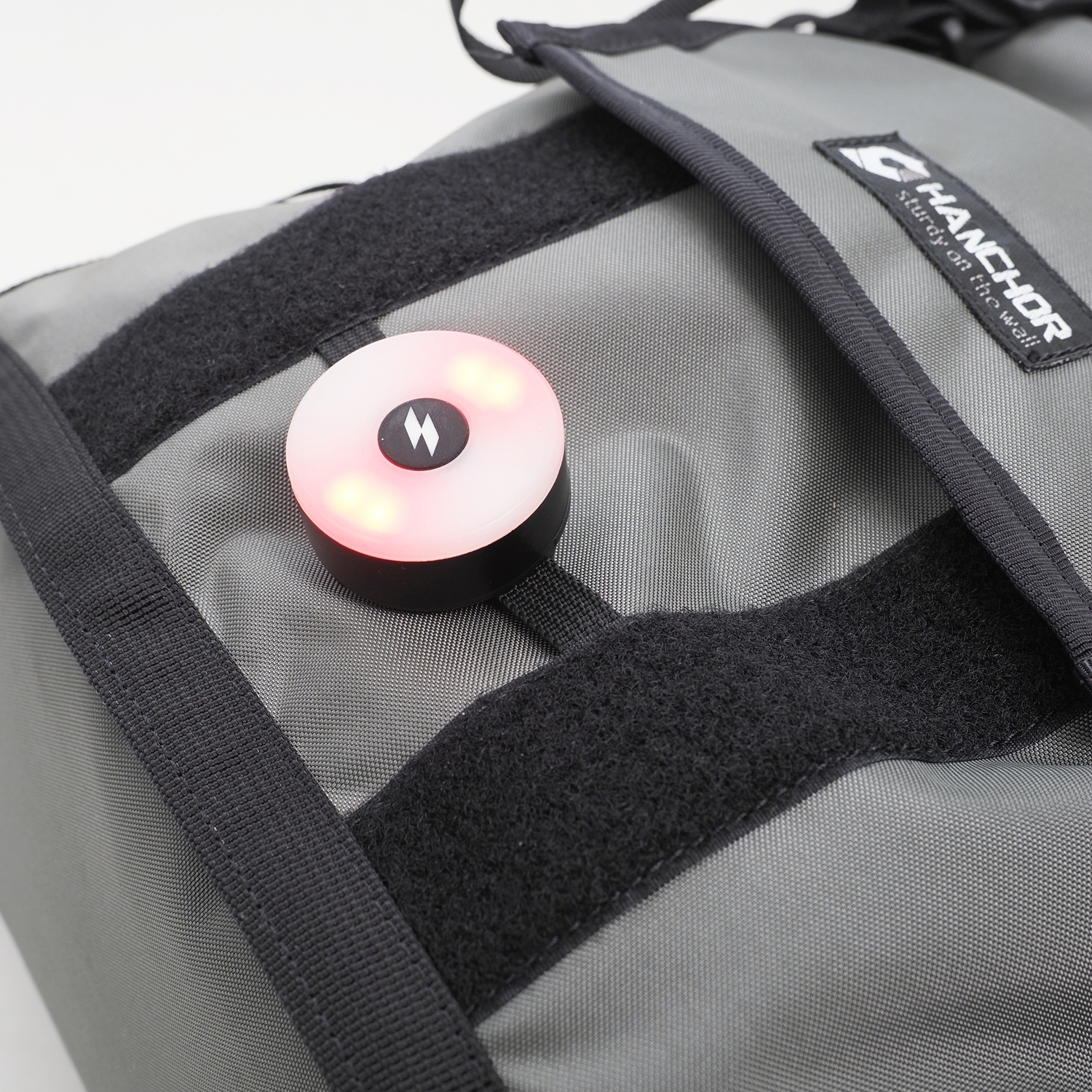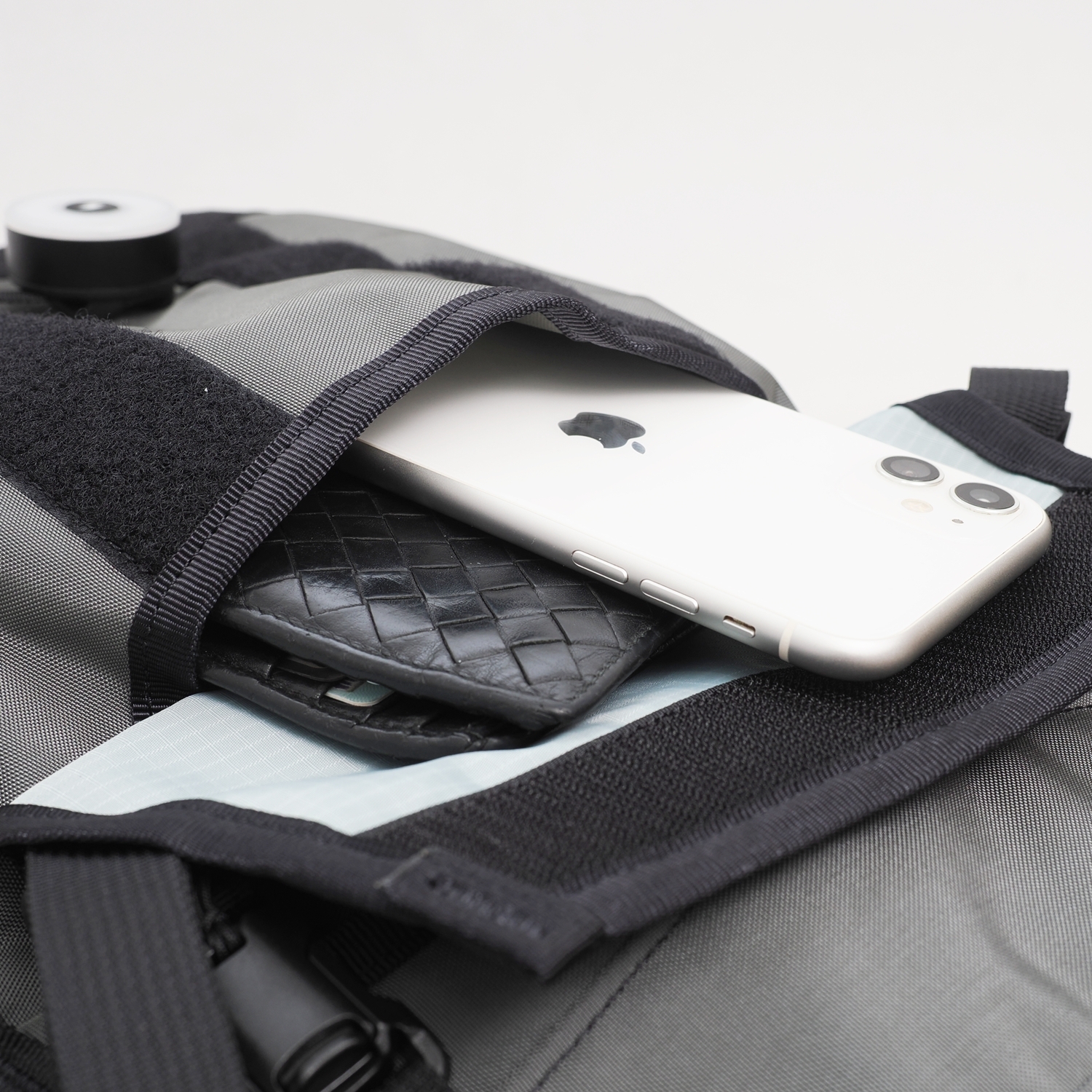A webbing loop is located below the pocket for attaching a safety biking light, enhancing security for night commuting or cycling.